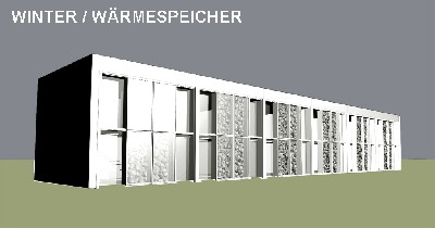 Wir entwickelten eine Südfassade, die auf die Jahreszeiten in Form von einem Schiebewandsystem reagiert, welches eine Steinwand jeweils entweder dem Außen-, bzw. dem Innenraum zuordnet.